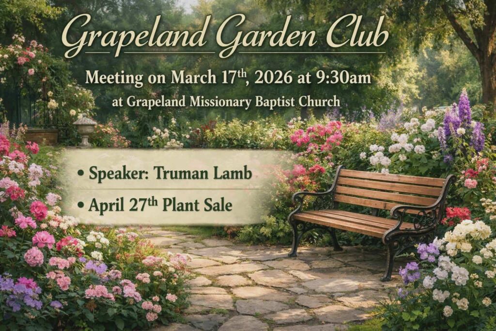 505 Fm 227 Grapeland, TX 75844 Directions Grapeland Missionary Baptist Church March 17, 2026 9:30 am Grapeland Garden Club Meeting